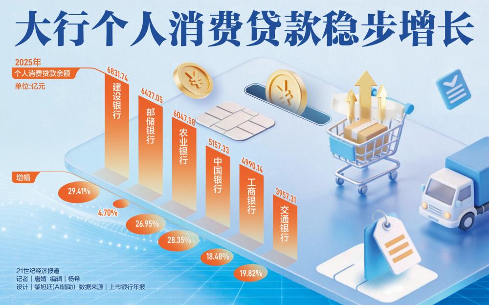 It can be seen that Construction Bank’s year-over-year growth rate and outstanding balance for consumer loans both ranked first among the six. In this regard, at the 2025 performance briefing, Vice President Tang Shuo of Construction Bank said that to boost consumption with financial support, the bank mainly did three things: first, actively strengthen business and financial collaboration, working jointly to carry out consumption-promotion activities; second, take initiative to implement the one-stop package of fiscal- and financial-coordination policies to stimulate domestic demand; third, focus on key consumer areas, and increase financial support and innovation efforts.