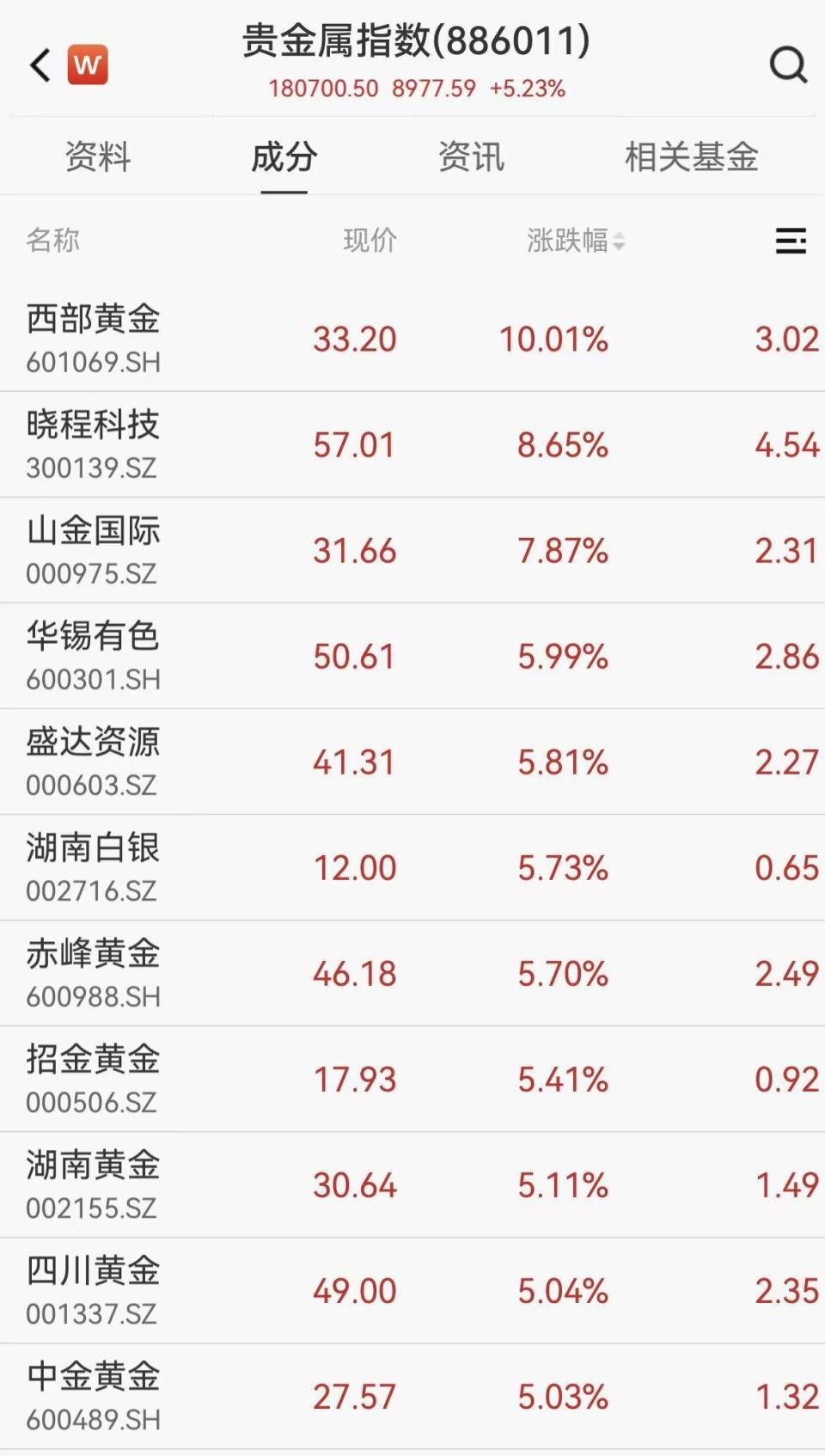 On April 8, the precious metals sector surged across the board. Western Gold hit the daily limit; Xiaocheng Technology, Shanjin International, Huaxi Nonferrous, Shengda Resources, Hunan Silver, Chifeng Gold, and others rose by more than 5%. Oil and gas stocks fell sharply. Blue Flame Holdings hit the daily limit down; Intercontinental Oil and Gas, Shouhua Gas, China Oilfield Services, Guanghui Energy, and others dropped by more than 8%.