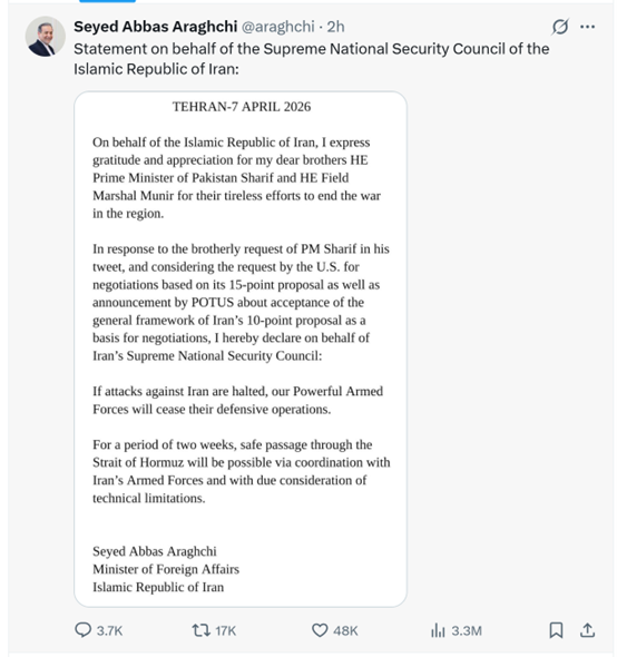 At the time Aragchi made these remarks, U.S. President Trump said on Tuesday evening local time that he agreed to pause U.S. bombing and attacks on Iran within two weeks. Iran also issued a statement saying it accepted the ceasefire proposal put forward by Pakistan.