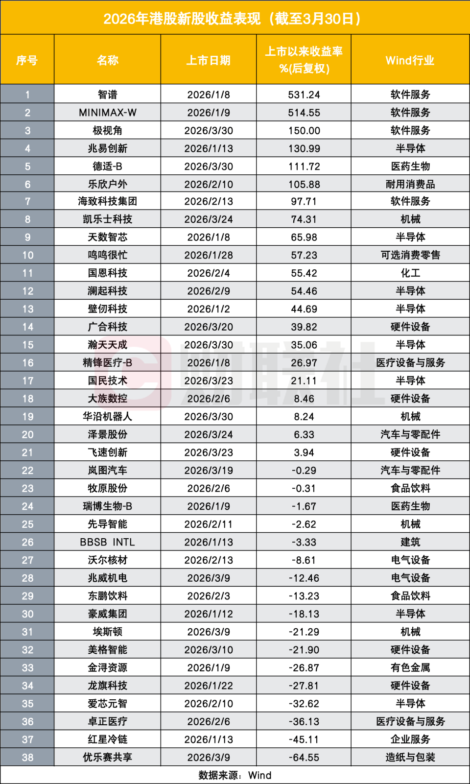 As of March 30, 2026’s Hong Kong market had welcomed 38 newly listed IPO stocks in total. Of these, 17 have fallen below their issue price, with the underpricing rate reaching as high as 44.74%. In 2025, the IPO underpricing rate for Hong Kong stocks was only 27.6%.