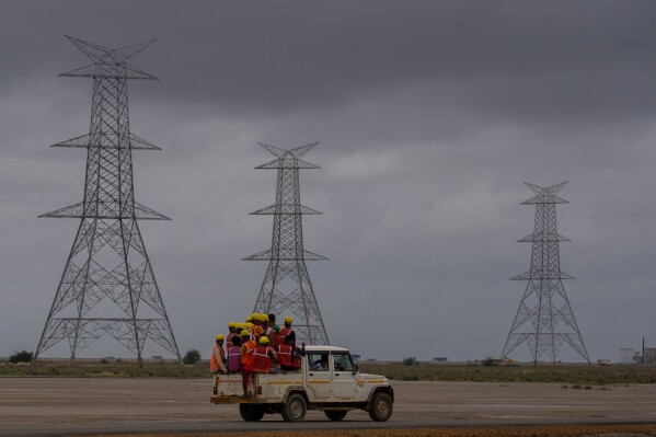 Workers travel in a vehicle toward the construction site of Adani Green Energy Limited’s Renewable Energy Park in the salt desert of Karim Shahi village, near Khavda, Bhuj district near the India-Pakistan border in the western state of Gujarat, India, on Sept. 21, 2023. (AP Photo/Rafiq Maqbool, File)