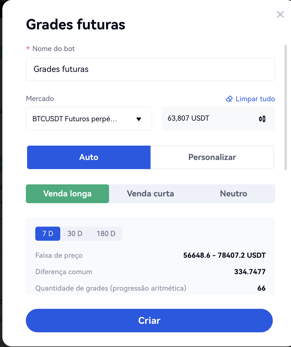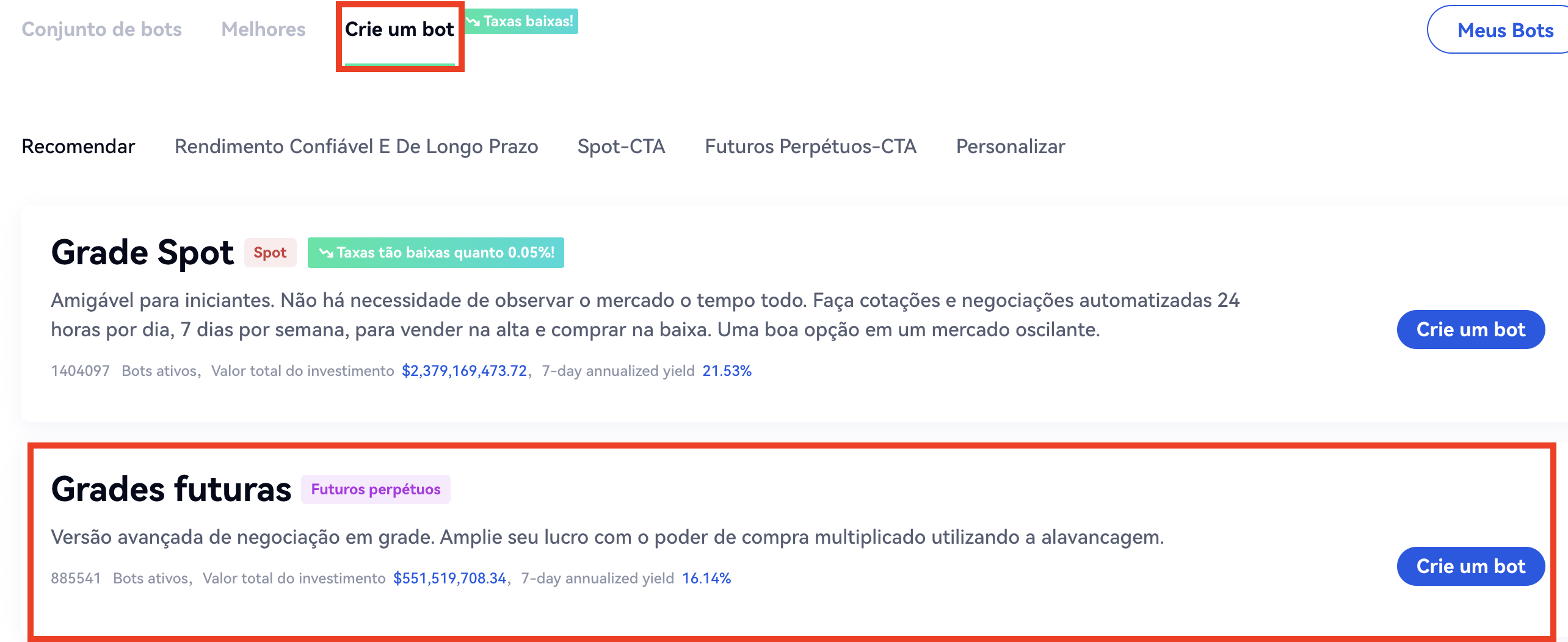 Barra de navegação - "Copy Trading" - "Strategy Bot" - "Criar Uma Estratégia" - "Recomendado" - "Grade Futuros" - "Criar Estratégia". Em seguida, escolha o par de trading, configure os parâmetros e clique em "Criar". Conforme mostrado na figura abaixo: