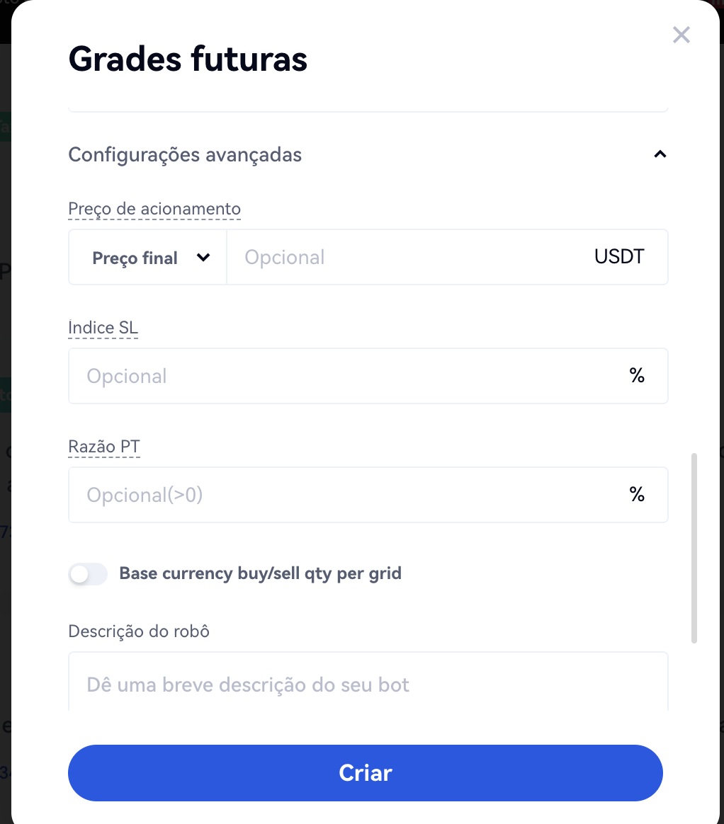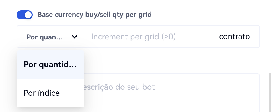 Quantidade de compra/ venda da moeda base por grade: Nas Grades Futuro, a quantidade de compra/ venda da moeda base por grid = 1.