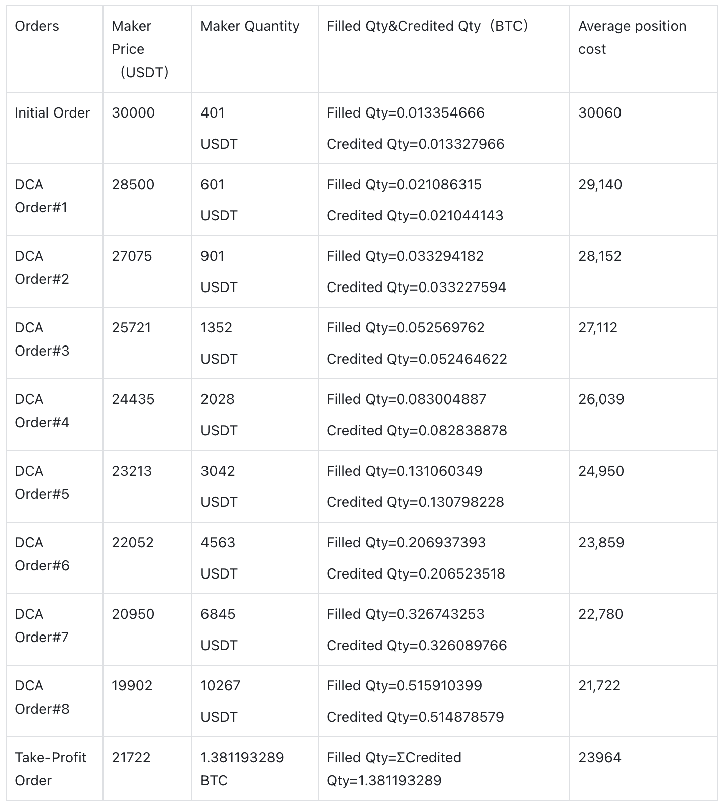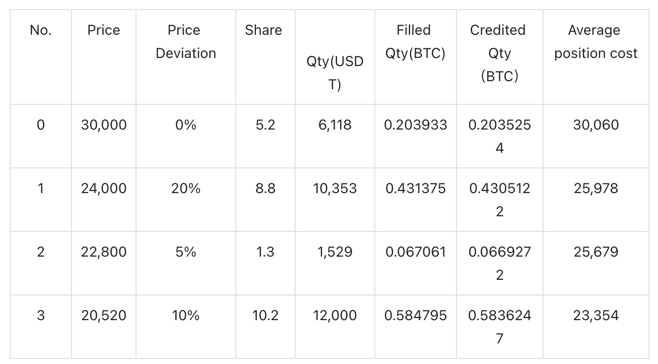 A porcentagem de queda de preço pré-definida para posições adicionais. Quando o preço do token cai pela porcentagem correspondente, uma ordem DCA será executada para aumentar sua posição e, portanto, reduzir o custo médio.