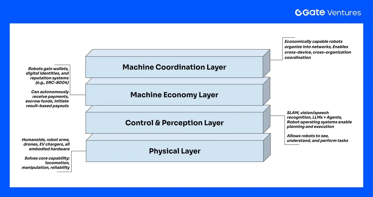Camada Física: A Camada Física inclui todos os transportes incorporados, como robôs humanoides, braços robóticos, drones e robôs de carregamento de veículos elétricos. Esta camada aborda questões fundamentais como “Pode mover-se?” e “Pode realizar trabalho físico?”—cobrindo locomoção, manipulação, fiabilidade mecânica e eficiência de custos. Nesta fase, os robôs ainda carecem de agência económica: não podem receber pagamentos, comprar serviços ou gerir recursos de forma autónoma.