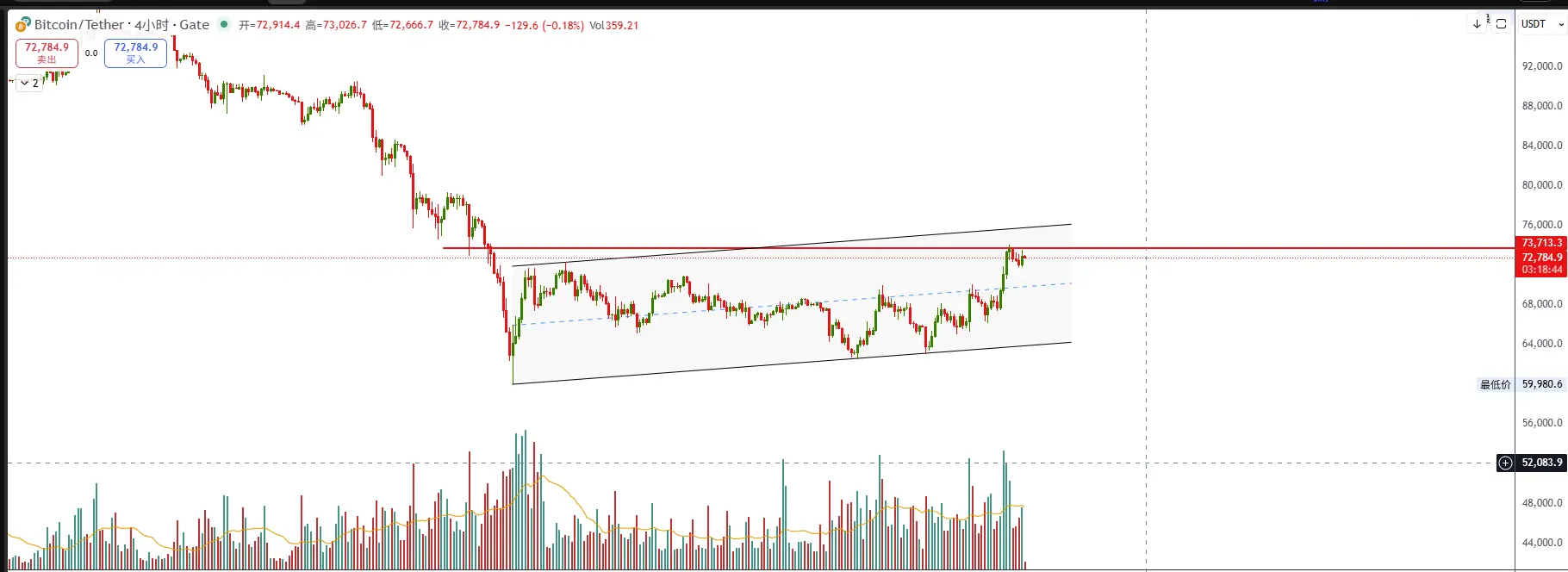 Até 5 de março de 2026, o Bitcoin de fato rompeu para cima do padrão mostrado no seu gráfico, subindo cerca de 2-3% nas últimas 24 horas, atingindo aproximadamente 73.000 dólares. A máxima recente de negociação foi de 74.000 dólares.
