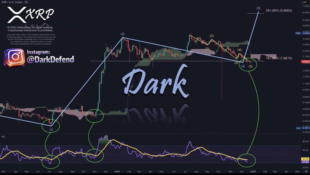 Dark Defender também aponta para uma escassez futura. À medida que menos vendedores estiverem dispostos a sair a preços atuais, até uma procura modesta pode começar a mudar o momentum. Historicamente, o XRP tem produzido movimentos fortes quando o RSI de prazos mais longos se reinicia durante períodos de mercado quietos como este.
