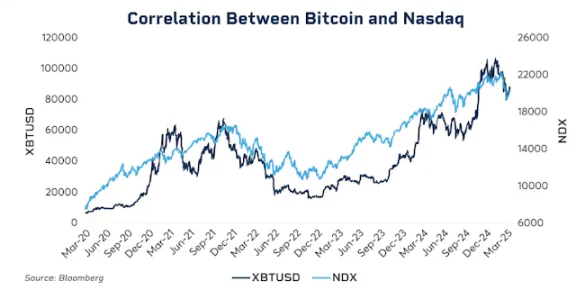 No início de 2025, a correlação de 30 dias entre Bitcoin e o Nasdaq 100 atingiu 0,80, o maior desde 2022. Em comparação, antes de 2020, essa correlação oscilava entre -0,2 e 0,2, sendo praticamente não relacionada.