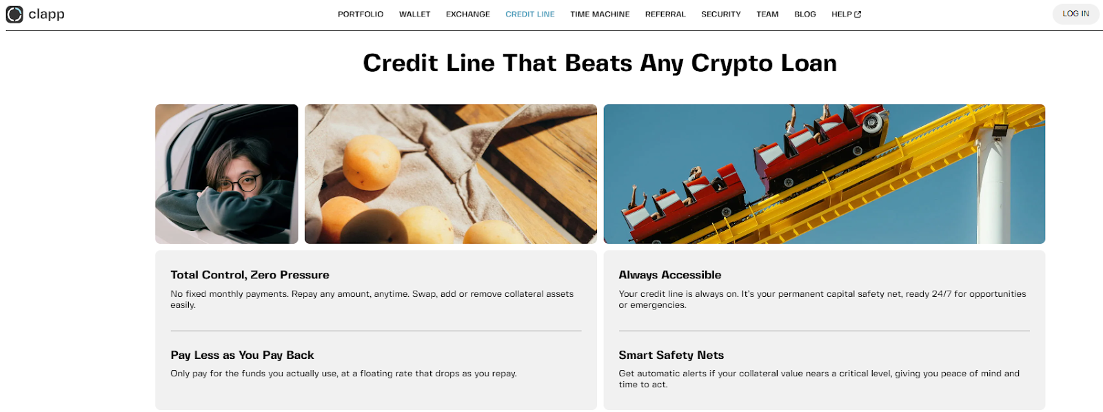 A Clapp oferece uma linha de crédito rotativa garantida por colaterais em criptomoedas. Os utilizadores depositam ativos e recebem um limite de empréstimo. As retiradas são opcionais e podem ser feitas a qualquer momento.