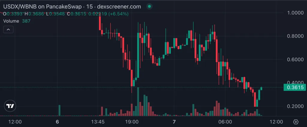15-minuto gráfico USDX/WBNB no PancakeSwap. Fonte: DEX Screener. No momento da escrita, a equipe emissora não comentou o ocorrido. Vários projetos — Lista DAO e PancakeSwap — emitiram declarações preliminares, observando que estão acompanhando o desenvolvimento dos eventos e aconselham os usuários a verificarem suas posições com USDX.