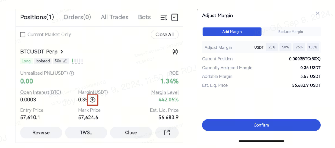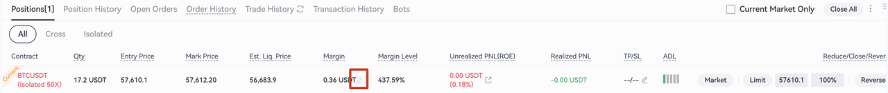 Кликните на значок редактирования во вкладке «Позиции», введите сумму маржи, которую вы хотите увеличить или уменьшить в окне «Регулировка маржи», и нажмите «Подтвердить».