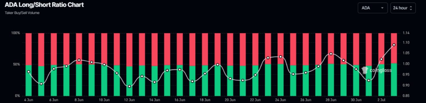 Бычье преобладание: Данные Coinglass показывают, что в четверг соотношение быков/медведей по ADA достигло 1.10, что является новым максимумом за более чем месяц. Это соотношение выше 1 указывает на то, что трейдеры делают бычьи ставки, ожидая роста цены ADA.