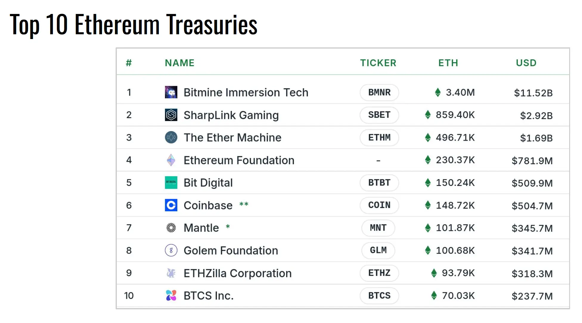 Крупнейшая казначейская компания по ETH — Bitmine, которая держит 3 505 723 ETH, что почти составляет 3% от общего предложения Ether, согласно данным CoinGecko.