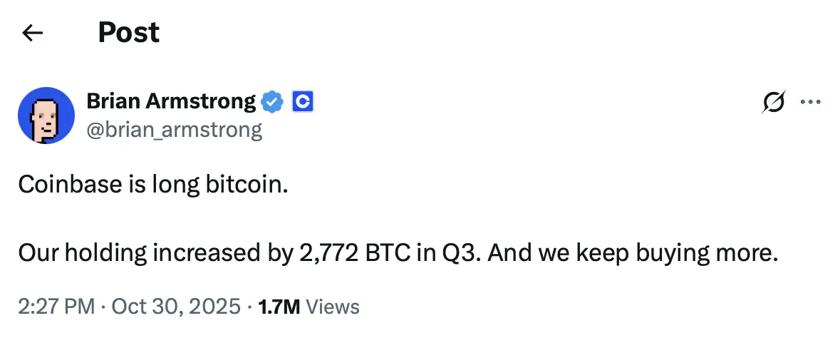 Генеральный директор Брайан Армстронг подтвердил покупки, написав в X: «Coinbase долго держит Bitcoin. Наши запасы увеличились на 2 772 BTC в третьем квартале. И мы продолжаем покупать больше.»