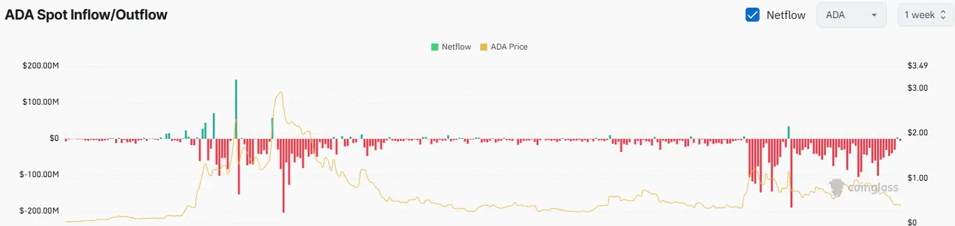 Поддерживая эти технические сигналы, данные о потоках блокчейна показывают, что чистые оттоки превышают притоки на биржах за последние месяцы. Перемещение запасов ADA в частные кошельки может помочь ограничить резкие распродажи. Даже на фоне резкого 24-часового падения постепенное снижение продаж, а не распродажа, вызванная объемом, предполагает среду, способствующую потенциальному техническому восстановлению.