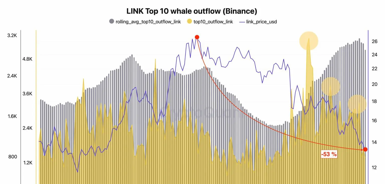 Chainlink (LINK), son 24 saat içinde büyük tutucuların pozisyonlarını artırmasıyla birlikte yeni bir balina akış dalgası görüyor. En büyük 10 cüzdan, aylık ortalama akışı 3,150 LINK'e çıkararak, mevcut fiyatlara göre yaklaşık 42,000 $ değerinde birikimi artırdı. Bu veriler CryptoQuant'tan alınmıştır.