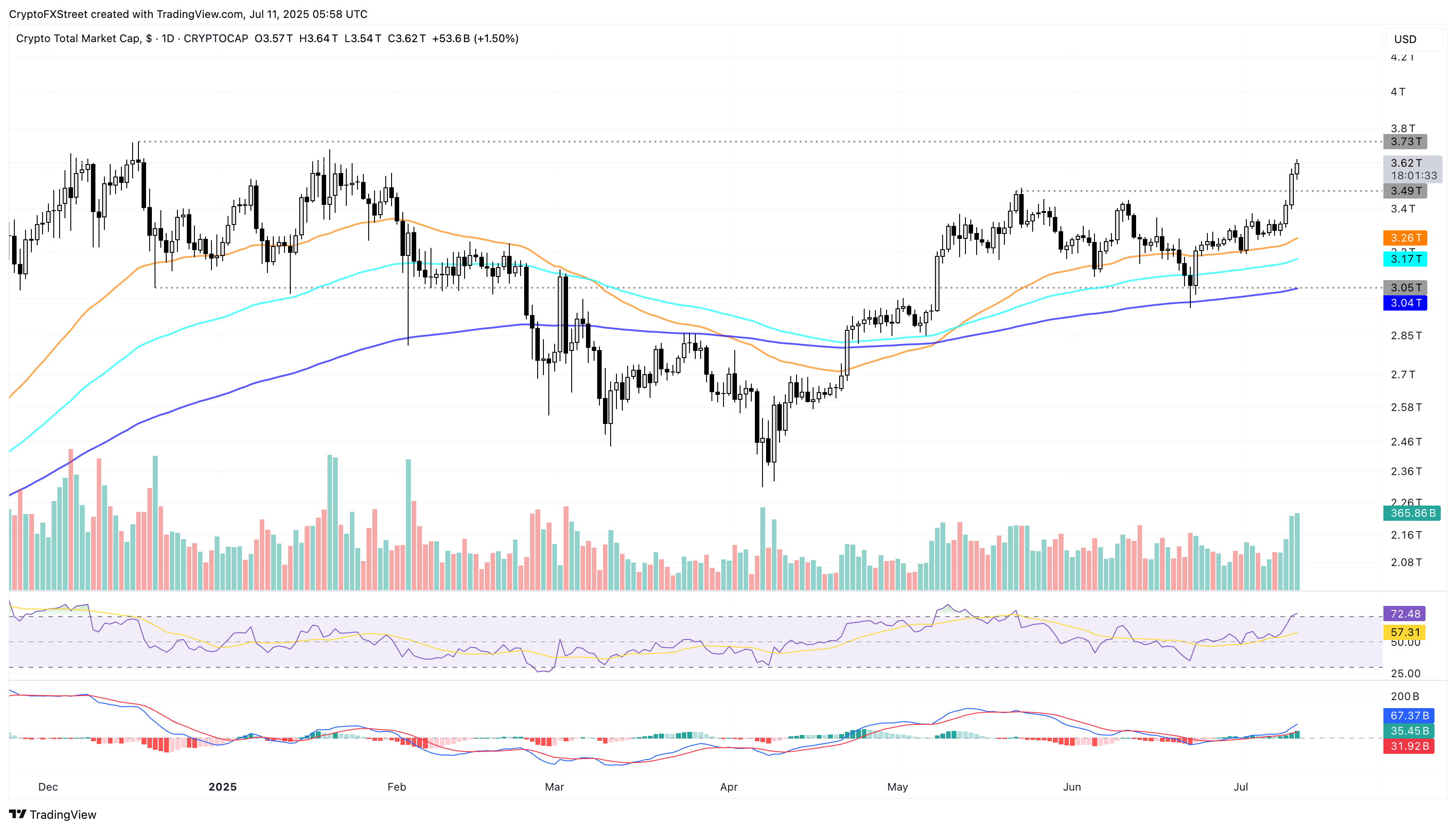 В п’ятницю (11 липня) під час азійської сесії, завдяки зростанню Біткойна (BTC), який досяг історичного максимуму в 118 000 доларів, ринок криптоактивів зростав четвертий день поспіль. Це сприяло тому, що ринок деривативів досяг історичного максимуму незакритих контрактів, а за останні 24 години обсяг ліквідацій шорт позицій перевищив 1 мільярд доларів. На ринку явно панують бичачі настрої, що може сприяти тому, що загальна ринкова капіталізація криптоактивів перевищить 4 трильйони доларів.