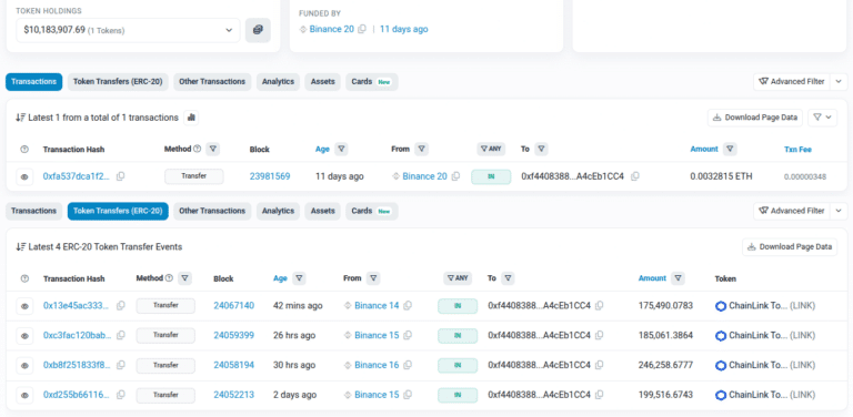Цей акаунт, адреса 0xf440838830CC265DB72C81bfBa240E5A4cEb1CC4, був активований 10 грудня шляхом виведення $10 вартості ETH, але почав накопичувати Chainlink лише 20 грудня в чотирьох загальних виведеннях приблизно по 2,5 мільйона доларів кожне.