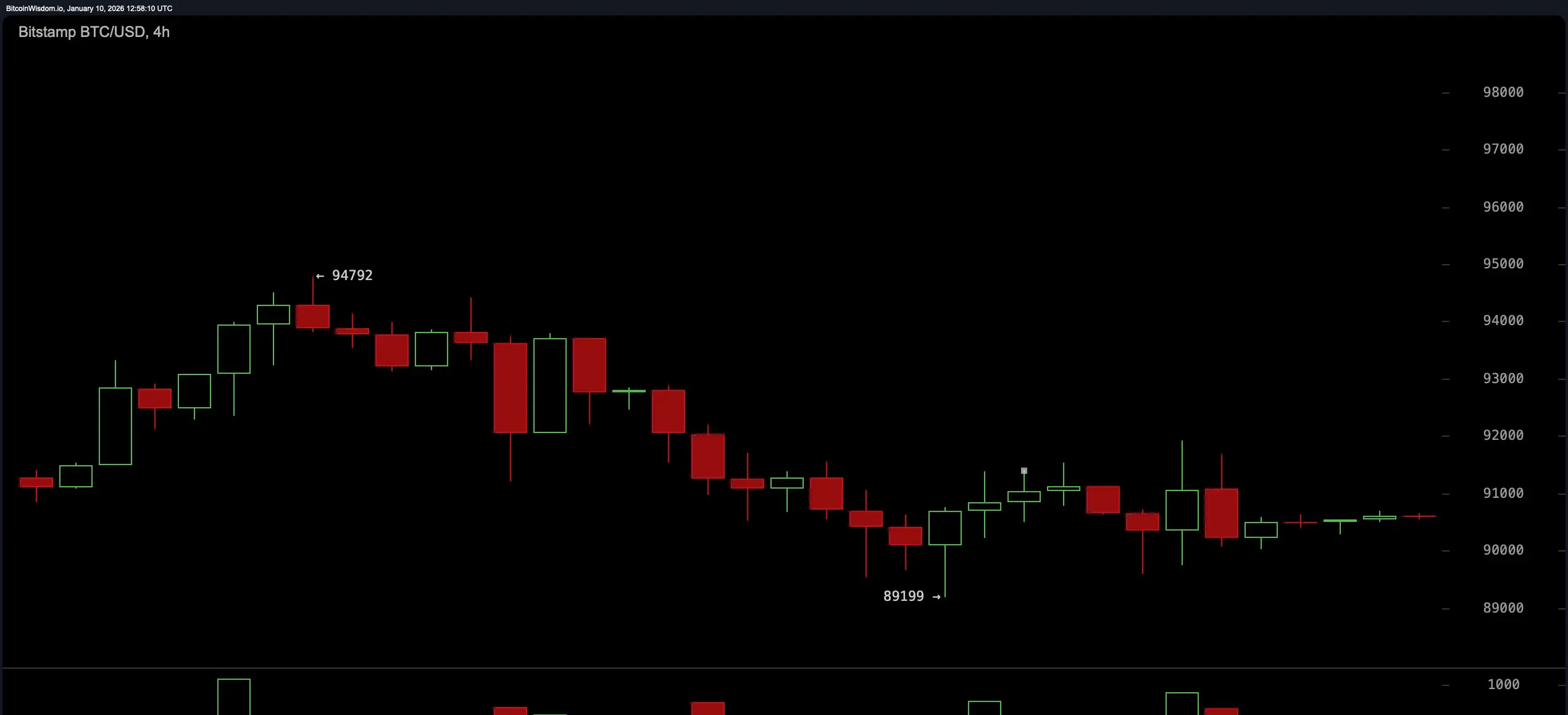 Щоденний графік читається як кінець спринту — біткойн підстрибнув з $84,398 до $94,792, перш ніж раптово втратити швидкість. Недавнє триденне відкотування повернуло ціну до патерну утримання навколо $91,000. Варто зазначити, що зменшення обсягу під час цього відступу було незвичайно високим, що є класичним ознакою тиску ведмедів, незважаючи на досить малий розмір денного свічки.