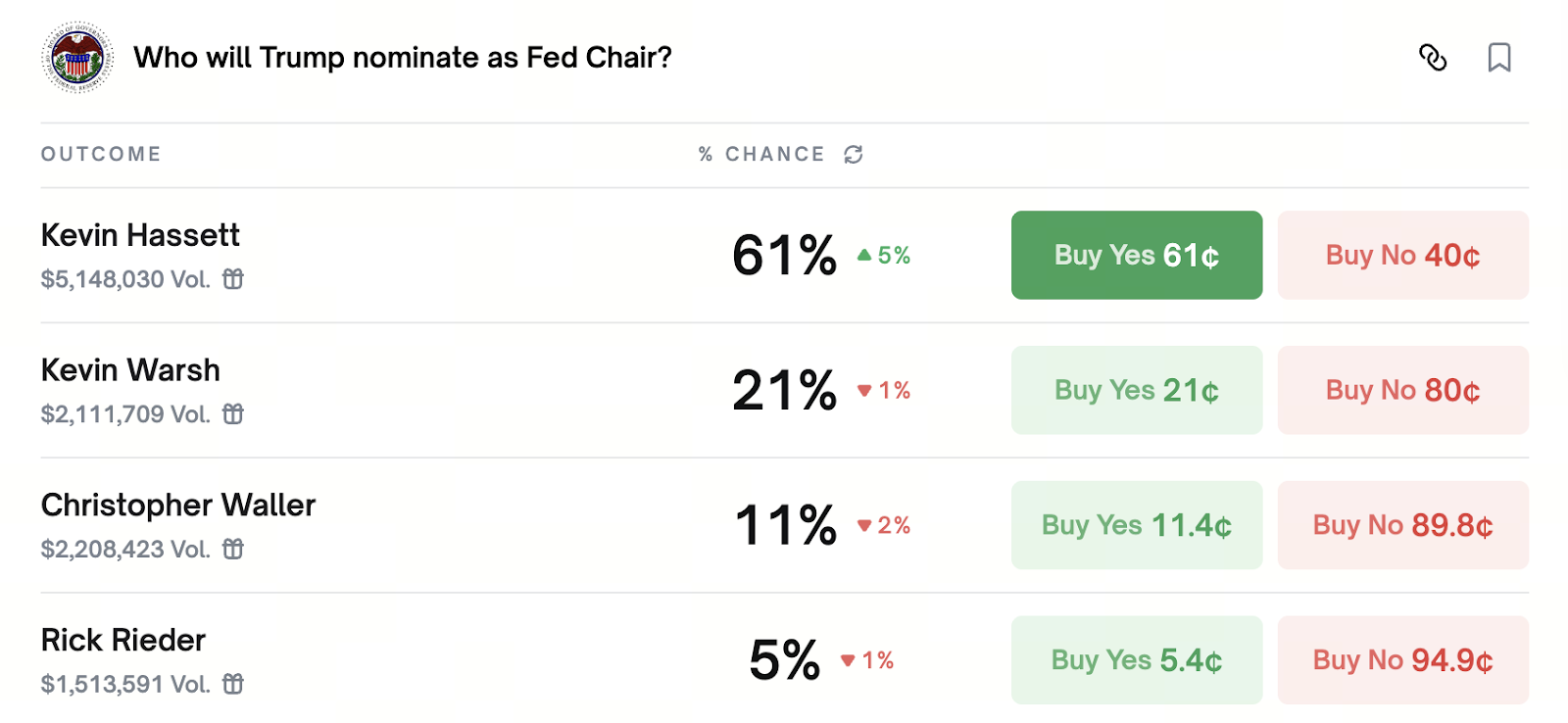 Trên thị trường dự đoán phi tập trung Polymarket, dữ liệu đặt cược về Chủ tịch Cục Dự trữ Liên bang tiếp theo cho thấy sự phân hóa rõ rệt. Xác suất mới nhất cho thấy Kevin Hassett, Giám đốc Hội đồng Kinh tế Quốc gia, hiện là ứng viên dẫn đầu với tỷ lệ 61%. Điều này phản ánh thị trường đang nghiêng mạnh về khả năng ông được lựa chọn.