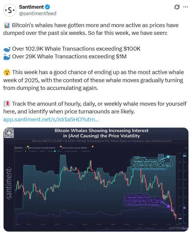 Bitcoin (BTC) đã giảm xuống dưới $90,000 vào tuần này — lần đầu tiên trong bảy tháng. Santiment cho biết họ đã theo dõi hơn 102,000 giao dịch cá voi vượt quá $100,000, và thêm 29,000 giao dịch trên $1 triệu.