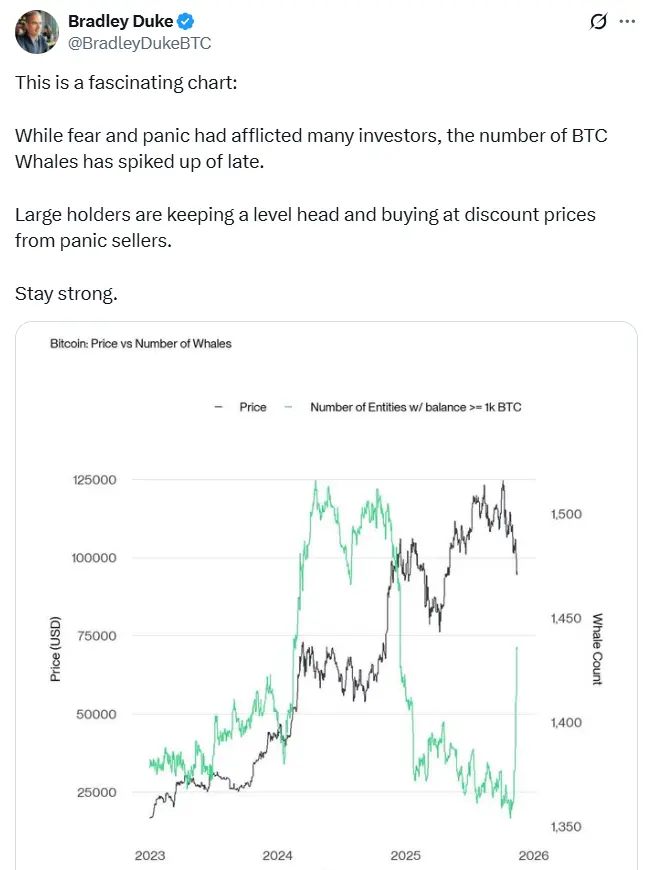 Bradley Duke, Giám đốc Điều hành và Trưởng bộ phận Quản lý Tài sản Bitwise tại Châu Âu, đã nói trong bài đăng trên X vào thứ Tư rằng công ty của ông đã nhận thấy rằng khi nỗi sợ hãi và hoảng loạn chiếm lĩnh thị trường, cá voi đã mua vào khi giá giảm.