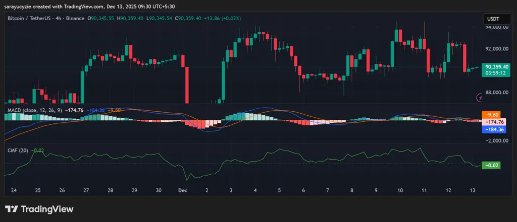 *Biểu đồ BTC (Nguồn: TradingView)*Hơn nữa, chỉ báo Dòng tiền Chaikin (CMF) của BTC ở mức -0.02 cho thấy áp lực bán yếu. Giá trị này hơi thấp hơn zero, thể hiện dòng tiền chảy ra, phản ánh sự do dự, không có bên mua hay bán kiểm soát rõ ràng.