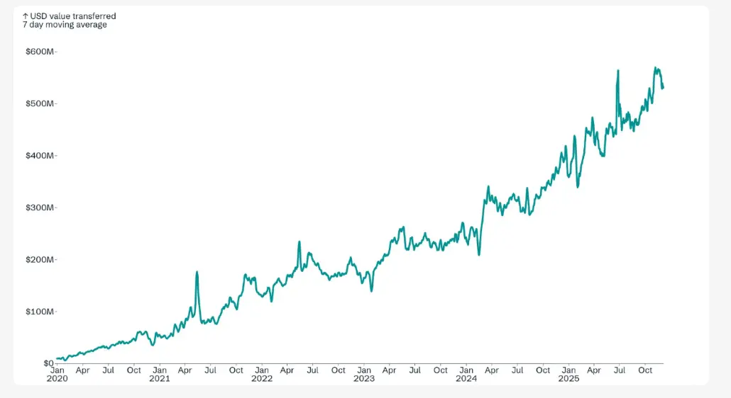 Các khoản chuyển giá trị nhỏ đã tăng đều từ năm 2020 và bứt tốc mạnh trong giai đoạn 2024–2025, với khối lượng trung bình mỗi ngày vượt 500 triệu USD. USDT ngày càng được sử dụng cho kiều hối, trả lương, mua sắm bán lẻ và chuyển tiền ngang hàng, đặc biệt tại các thị trường mới nổi – nơi việc tiếp cận USD truyền thống còn hạn chế. Cùng với khung pháp lý dần rõ ràng và hạ tầng được nâng cấp, USDT đang khẳng định vai trò như một mạng lưới thanh toán kỹ thuật số toàn cầu.