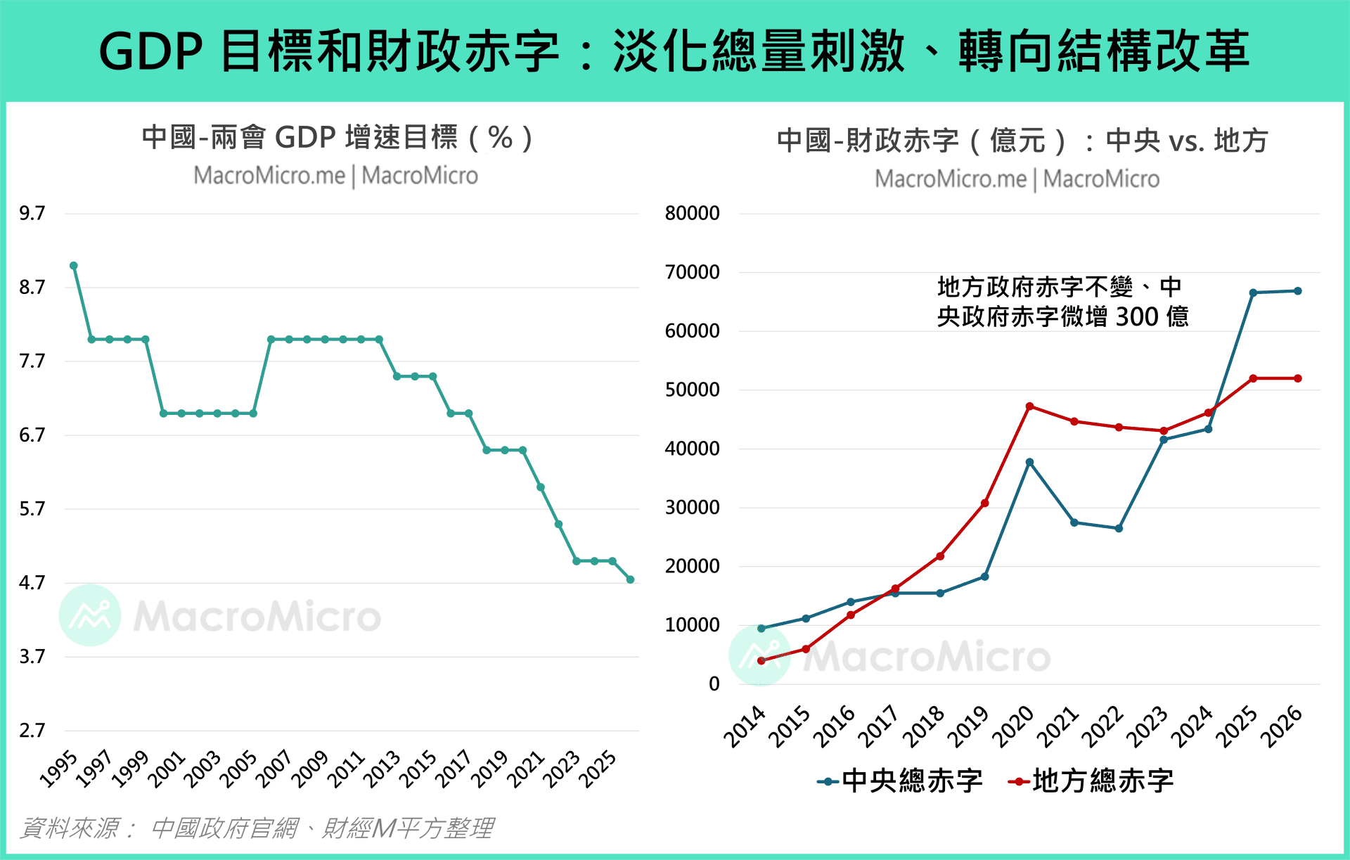 Chúng ta bắt đầu từ báo cáo công tác chính phủ của hai kỳ họp Trung Quốc đầu tháng 3, quan sát những thay đổi từ trên xuống dưới. Trong báo cáo, chúng ta thấy hai điểm chính, thứ nhất, chính sách kinh tế hiện tại của Trung Quốc đang dần chuyển trọng tâm từ mục tiêu tổng thể sang chuyển đổi cấu trúc tinh vi hơn, điểm rõ nhất là mục tiêu tăng trưởng GDP lần này đã điều chỉnh từ 5% xuống khoảng 4.5% ~ 5%, là lần đầu tiên từ bỏ mục tiêu 5% kể từ năm 2023.