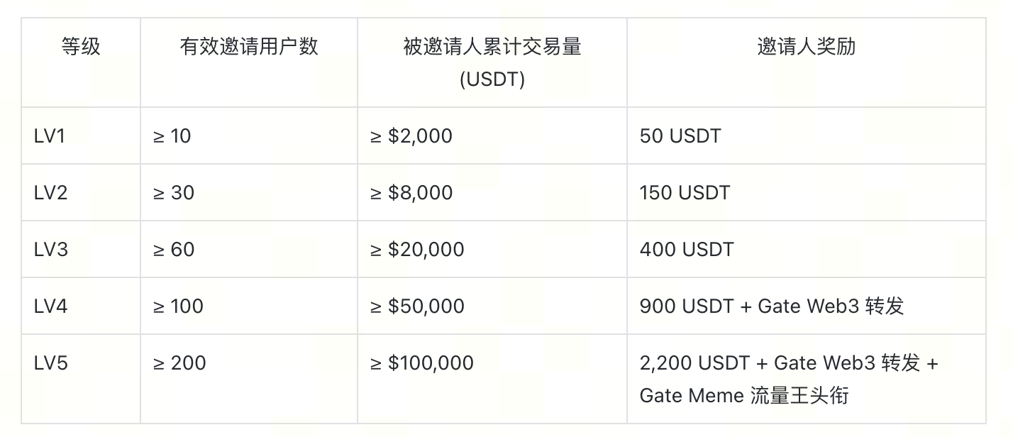 前往 Gate Web3 邀请好友页面 生成邀请链接,使用你的 referral link 邀请用户在Meme Go(Meme 交易)和 Gate Swap(LP & Token Swap)完成交易,即可参与 KOL 等级挑战。根据累计有效交易额 获得对应奖励。 Gate Web3 网页端首次交易量(含首次 Swap、首次 Meme Go 交易)≥ 10 USDT ,即视为“有效邀请”。有效交易额包含:Meme Go 净交易量和 Gate Swap 兑换量。奖励上限为每 KOL 单人最高可获得 2,200 USDT。奖励按“达成最高等级发放”,且同时享受 DEX Referral 20%交易自返佣 + 30% 好友交易实时返佣。