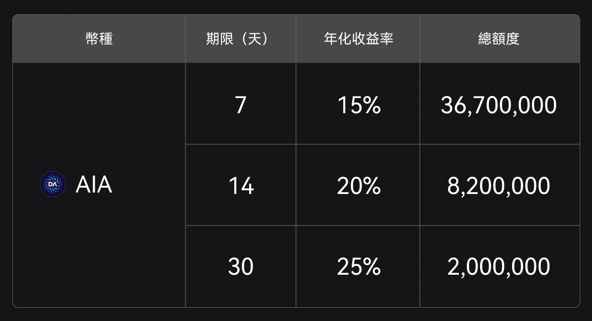 Gate 餘幣寶現已上線 AIA 定期理財,提供 7 天、14 天、30 天三種鎖倉週期,年化收益率最高可達 25%,最低僅需 10 AIA 起投,歡迎前往參與申購。
