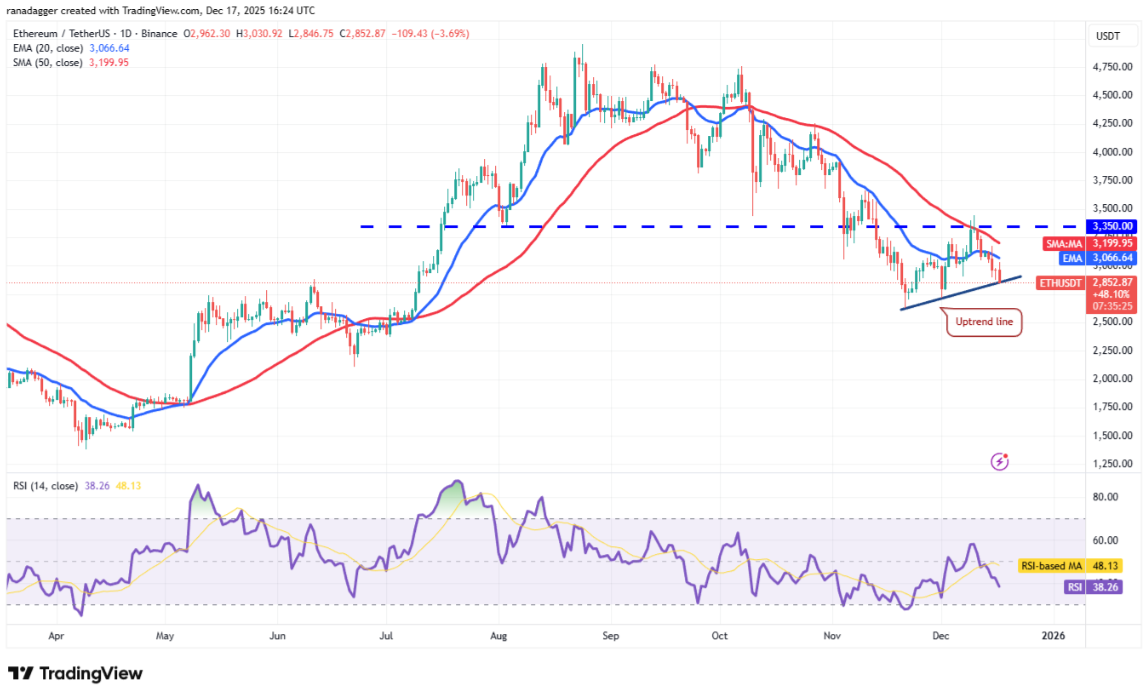 以太幣 (ETH) 在週二反彈自上升趨勢線,但在週三被20日EMA (3,066美元)阻擋。