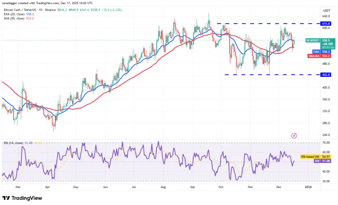 比特幣現金 (BCH)在週二反彈自50日SMA (SMA) 534美元。週三,多頭正努力將價格維持在20日EMA (EMA) 558美元之上。