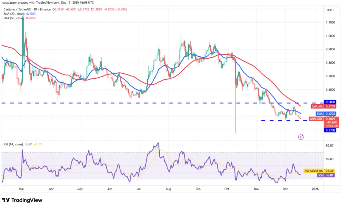 Cardano (ADA)的價格在0.37美元支撐區遇阻,顯示多頭缺乏足夠的買盤動能。