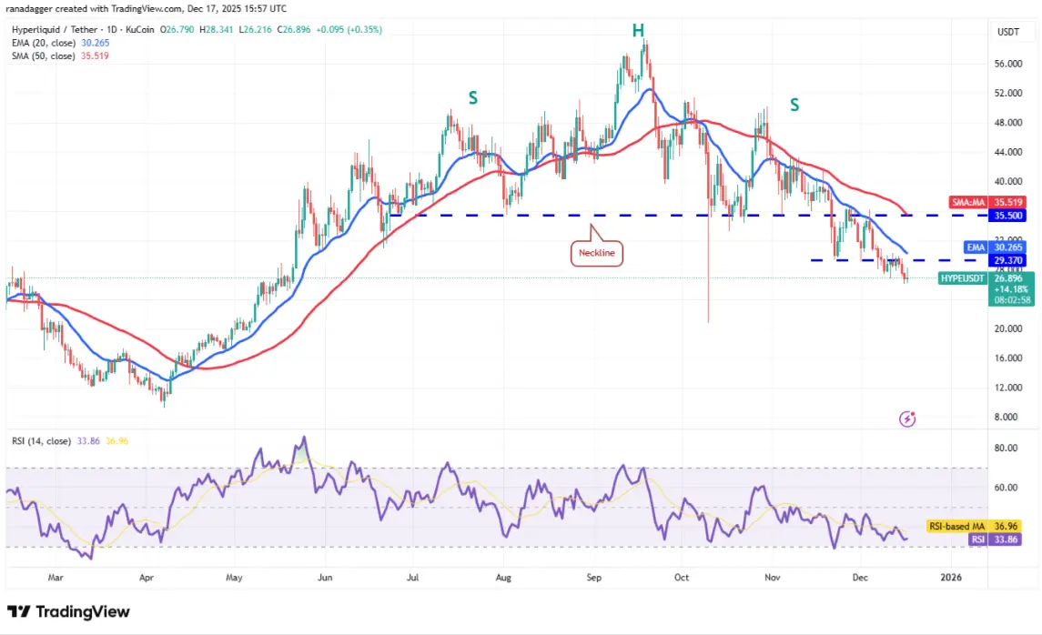 買方正試圖啟動Hyperliquid (HYPE)的反彈,但反彈動能可能在接近30.26美元的20日EMA附近遇到強大賣壓。