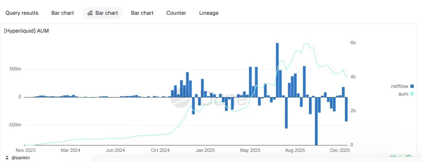 根據 @sankin_eth 控制台的數據,Hyperliquid 在過去一週內錄得超過 4.3 億美元的淨資金流出,標誌著自該平台推出以來第三大出流週。這一變化顯示,在去中心化衍生品市場競爭日益激烈的背景下,Hyperliquid 正面臨越來越大的壓力。