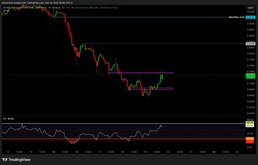 Aster 價格在接近 $0.98 被拒後一直大幅下跌。TradingView 的圖表顯示出一個穩定的階梯式下行,接著在中 $0.60s 進行更深的清洗,直到買家最終介入,將 ASTER 價格推回到低 $0.70s。