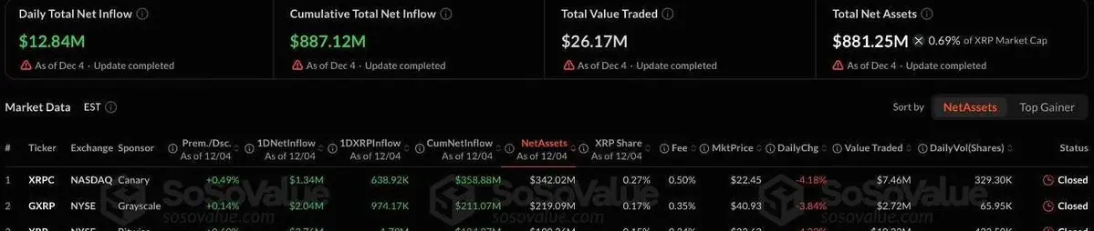 這些數據也強化了ETF在塑造XRP市場結構中日益重要的角色。當日成交總額達2,617萬美元,ETF資產總淨值現為8.8125億美元。隨著流入持續,ETF需求正逐漸成為XRP價格走勢的主導力量,尤其是在散戶活動疲弱期間。