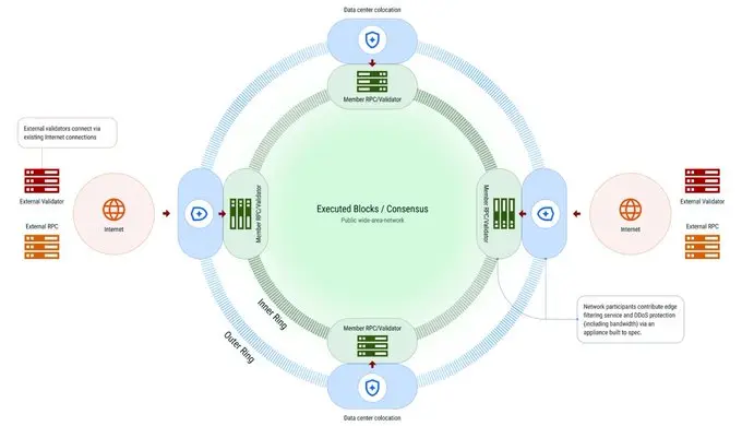 外环与公共互联网相连,DoubleZero 在这里部署使用高性能硬件,用于抵御 DDoS 攻击、验证签名和过滤重复交易。
