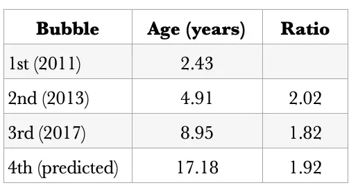 粗略地观察年龄比率。前两个相邻的大泡沫之间的比率分别为 2.02 和 1.82,取平均1.92,第四次泡沫大约在年龄 17.18 年(2026 年初)。当然,这只是粗略的初步猜测**。**