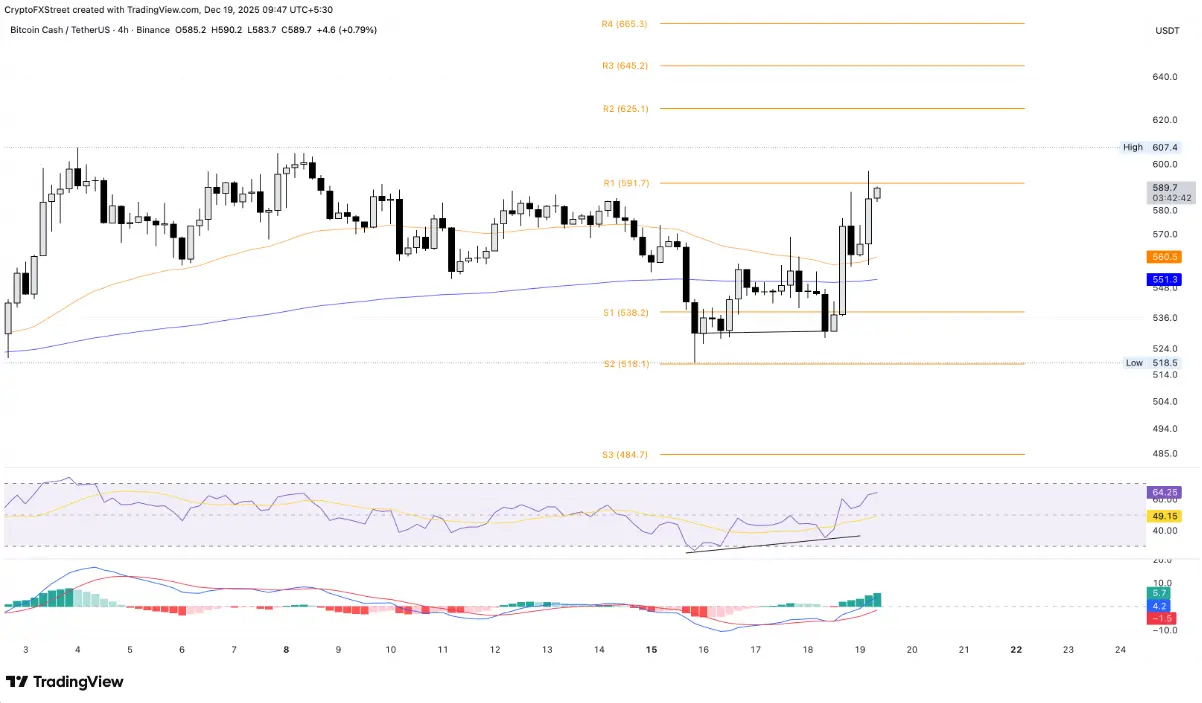 比特币现金 (BCH) 目前在4小时图上稳固运行在50日指数移动平均线 (EMA) 和200日EMA之上,且已完成在530美元支撑区附近形成的双底形态。随着BCH逼近关键枢纽点R1(591美元),上涨动力逐步增强,市场预期将形成一根收盘于该阻力位之上的积极蜡烛。