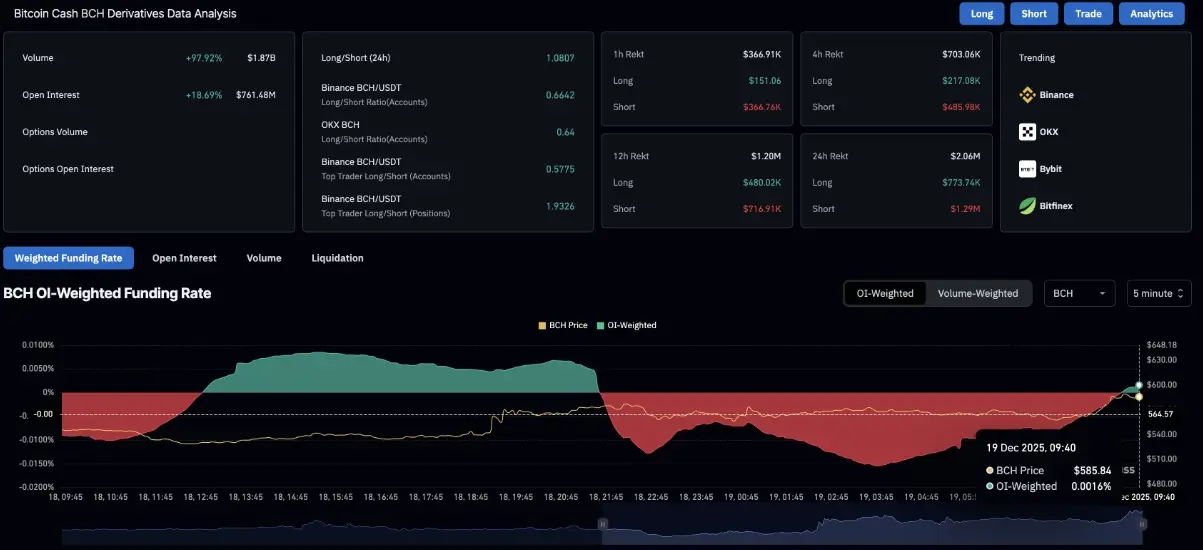 根据CoinGlass的数据,BCH期货市场的未平仓合约 (OI) 在24小时内上涨18.69%,达到7.6148亿美元。这表明在风险偏好改善的背景下,资金正重新流入市场。值得注意的是,融资费率已由当天之前的-0.154%转为正值0.0016%,确认买盘力量正在激活,并巩固BCH的短期上涨趋势。