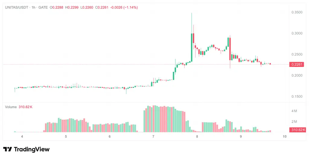 根据 Gate 行情数据(截至 2026 年 4 月 9 日),UNITAS 代币当前报价为 0.2292 美元,24 小时交易额录得 433 万美元。其价格在过去 24 小时内经历了 13.74% 的显著回调,但若将时间轴拉长至月维度,其累计涨幅依然接近两倍。